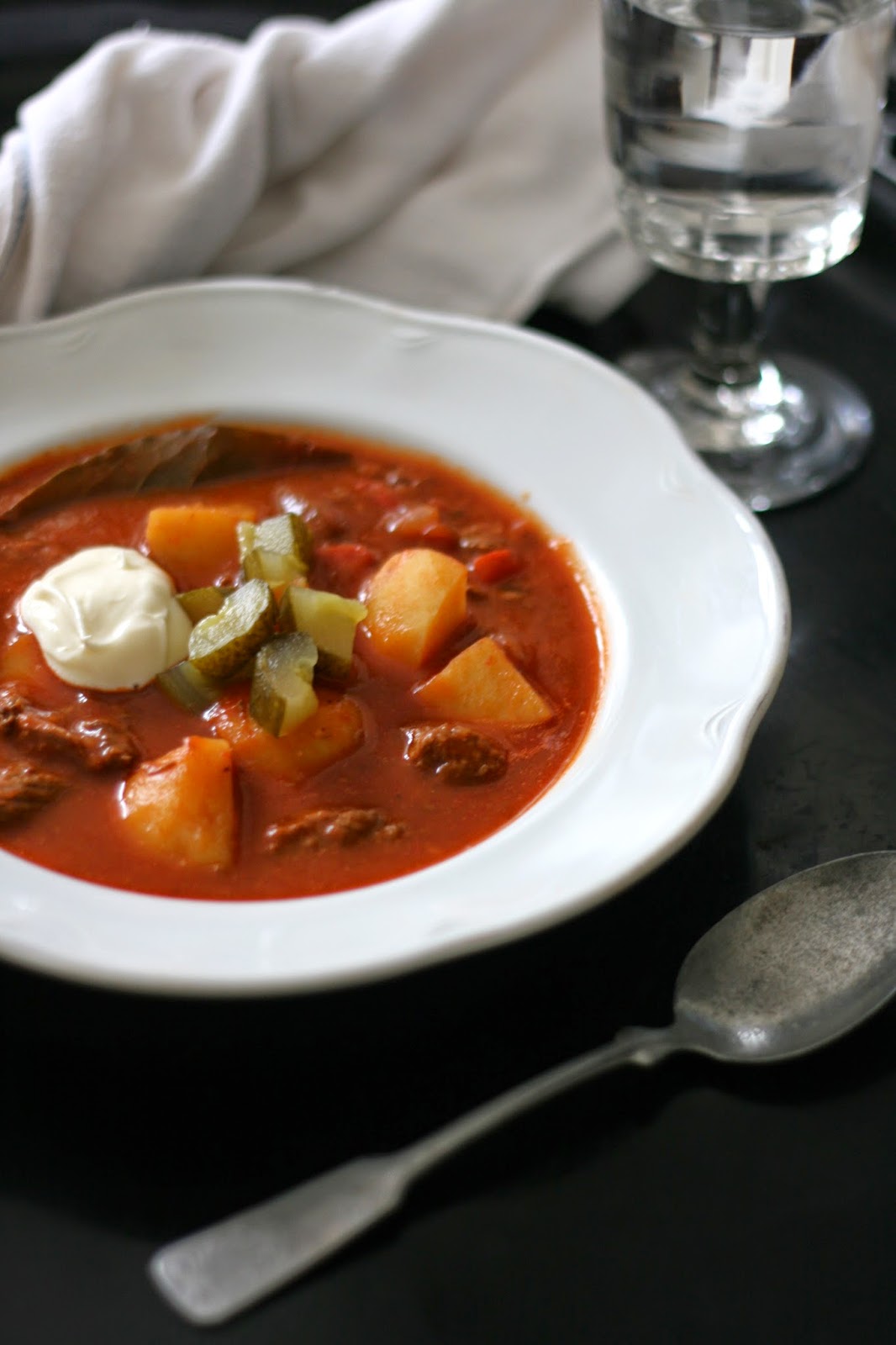 Tarjoa keitto smetanan ja silputtujen suolakurkkujen kera.